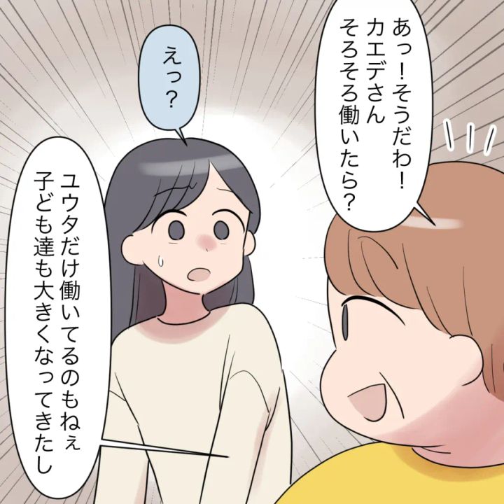 すると良いことを思いついたと言わんばかりの顔で、義母が私に働きに出るように提案しました。「ユウタだけ働いているのもねぇ。子ども達も大きくなってきたし。」と、まるで私が好んで仕事を辞めて家に入っているかのような言い方。引いてしまいました。
