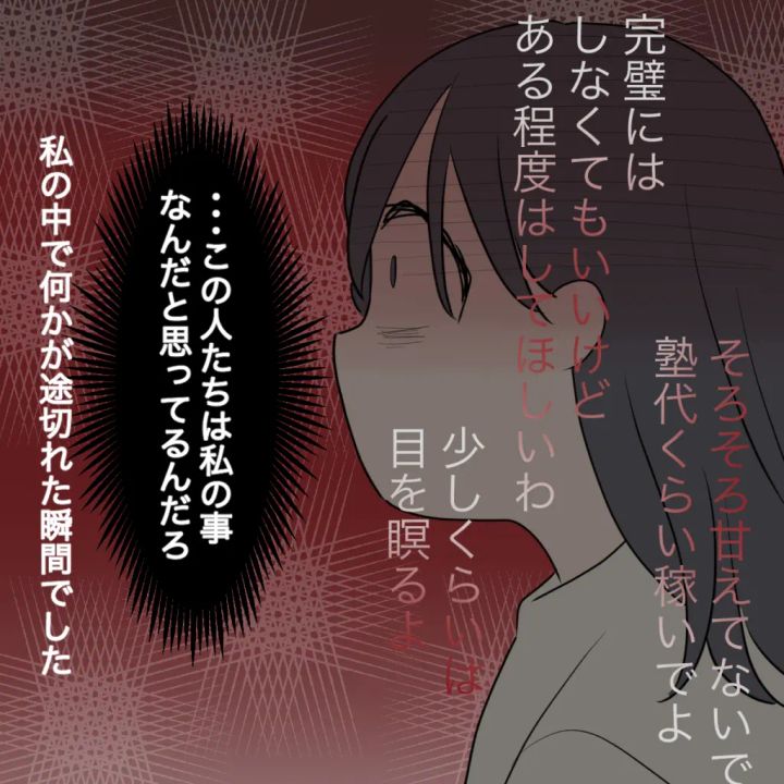 義母と夫のあまりにも自分勝手な言い分を聞きながら「この人達は私の事、なんだと思ってるんだろ」とあらためて考えると、私の中で何かがプツリと途切れたのがわかりました。