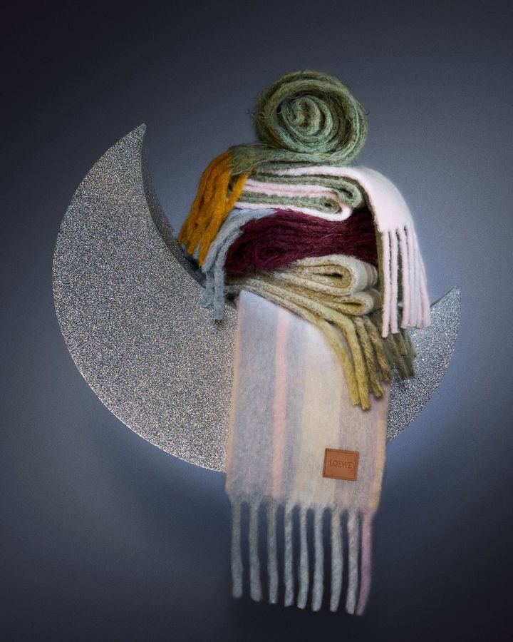 今季のホリデーコレクションは、「猫を描いた男」として知られるイギリスのアーティスト、ルイス・ウェインの作品が着想源。彼の代表作「Futurist Cats(未来派の猫)」に見られる幾何学的な構成と色彩を、ロエベのクラフツマンシップと融合させ、幻想的な世界観を再構築している。