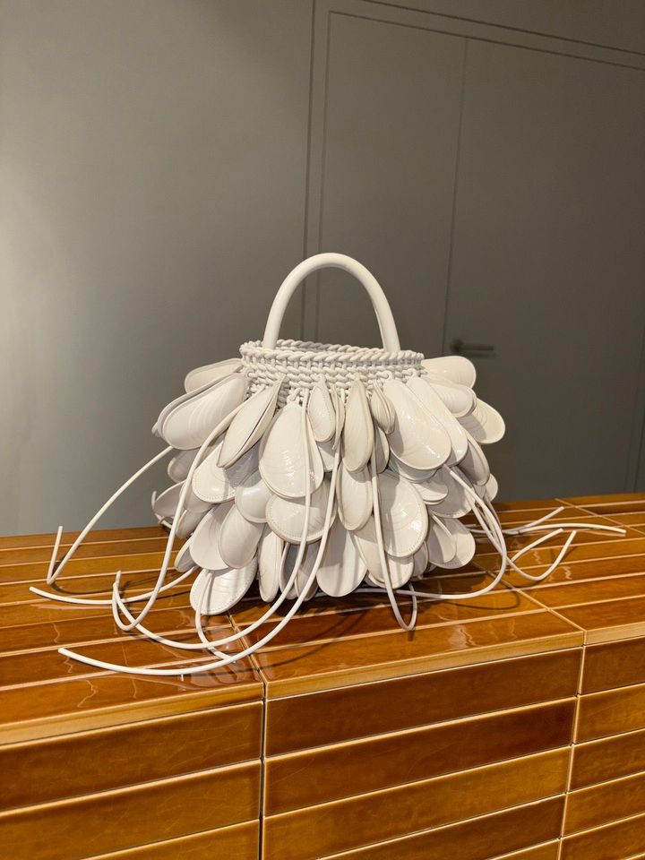 特に「フューチャリスト キャット クラッチ」は、ウェインの磁器作品を建築的な構造で再解釈した注目アイテムだ。ほかにも、猫の顔や足、ストライプを抽象的に描いたプリントバッグや、レザーの質感を際立たせた新作「ドレープ トート」などが登場する。