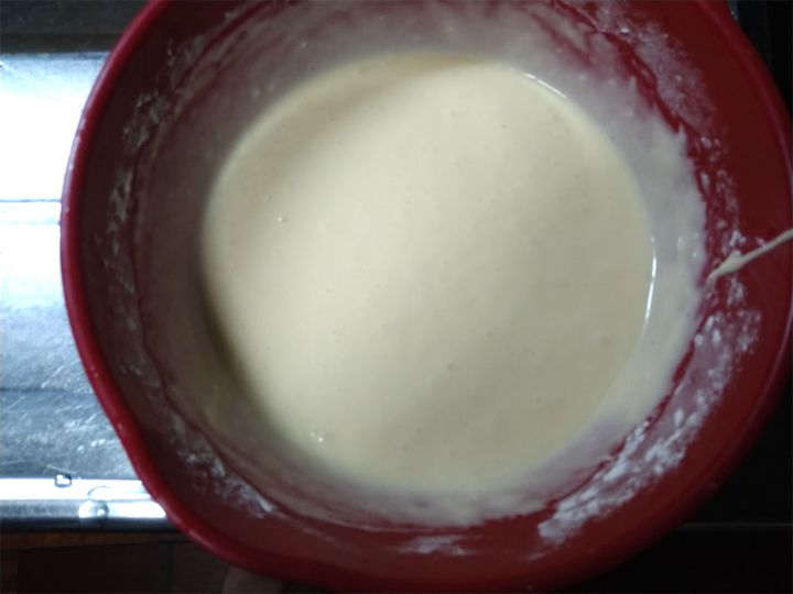 2. 1に溶いた卵とヨーグルトを入れて、さらに混ぜ合わせる。