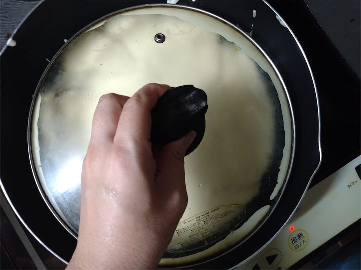 4. フライパンにサラダ油を加えて熱したら、生地を流し込む。弱火で6分ほど焼いて、表面が乾いてきたら火を止める。粗熱が取れるまでそのままにする。