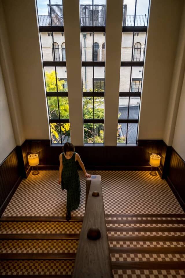 館内にはエレベーターもありますが、是非楽しんでいただきたいのが階段を使った上り下り。学校に限らず古い料亭や老舗の日本旅館などは階段がしっかりと作られていることが多く、ホテル青龍でも建物の記憶として当時の姿を残しています。子供の身長に合わせて段差が低く、生徒がよく通るイン側がすり減っていたり。木製の手すりに生徒の落書が残っていたり。踊り場の窓は当時のまま残され、階によっても異なることをぜひ注意して見てください。