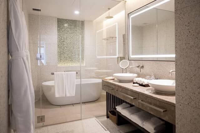 洗面には大きなライティングミラーが架かりダブルベイシンが採用されるなど、便利さは申し分なし。レトロなデザインの水栓も雰囲気があって、利用するのも楽しめます。奥には据え置き式の重厚なバスタブが置かれ、レインシャワーを備えるなど、ゴージャスな気分を演出します。
