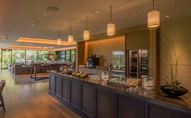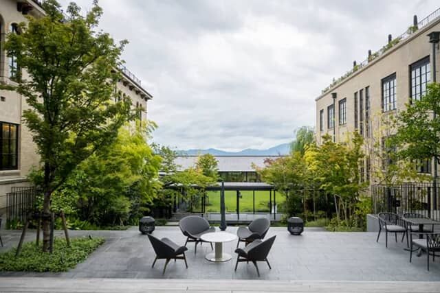 中庭にある大階段の最上部は広いテラスになっていて、朝食も屋外で楽しめます。小鳥のさえずりも聞こえ、正面にあるレストラン「ブノワ 京都」の屋根が京都の街を隠し嵐山方面の山々が見えることから、都会にいながらリゾートステイをしている気分を味わえます。