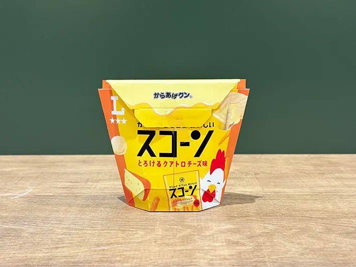 パッケージには、からあげクンのキャラクターが『スコーン とろけるクアトロチーズ』を食べているイラストが描かれています。