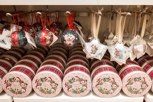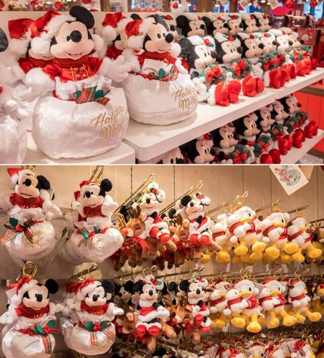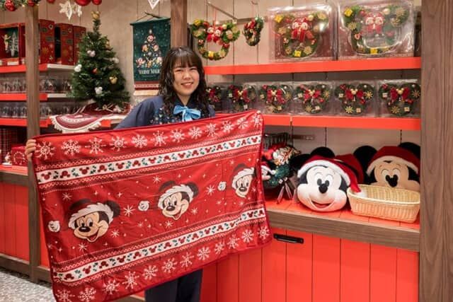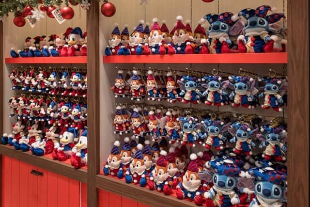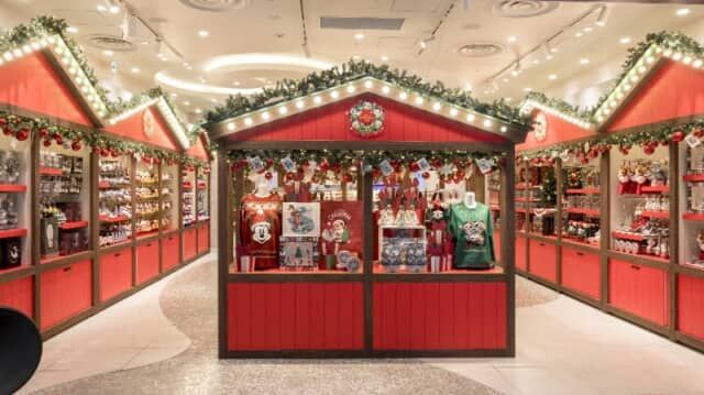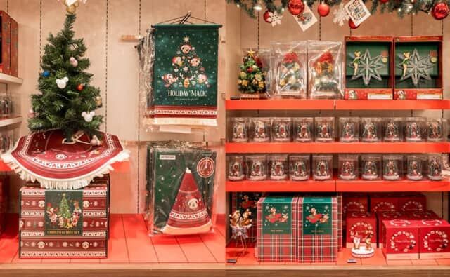 クリスマスをテーマにした特別な店内装飾のディズニーフラッグシップ東京。クリスマスのデコレーショングッズやお菓子、ぬいぐるみやアパレルなどが並びます。