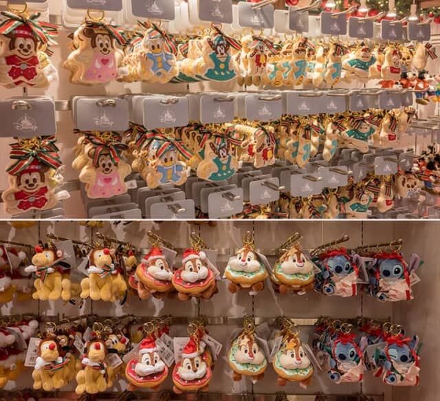 アイシングクッキーをイメージしたぬいぐるみキーホルダーは、クリスマスツリーのオーナメントとしても飾れます。写真(下)はドーナツから顔を出すチップとデール、ラッピングバッグをビリビリ破いて顔を出したスティッチのぬいぐるみキーチェーン(各¥3,000)など、多彩なキーチェーンをそろえます。