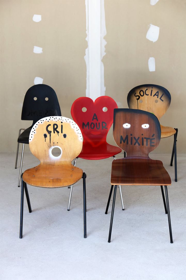 すべて再利用品である椅子は、ひとつひとつ民主主義への疑問を投げかける言葉が記され、市民の円形議場(アッセムブリー)となってフランス国立公文書館の広大な中庭に現れた。