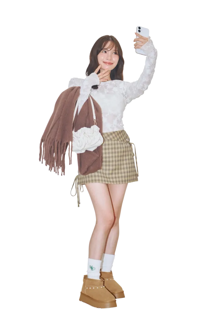 ボディスーツは着回し。チェック柄ミニスカート 11,110円/CRANK(HANA SHOWROOM)マフラー 5,500円/MERCURYDUO ルミネエスト新宿店 バッグ 12,100円/RESEXXY ソックス 2,200円/Mardi Mercredi(MARDIMERCREDI JAPAN)ムートンブーツ 21,450円/ダイアナ(ダイアナ 銀座本店)