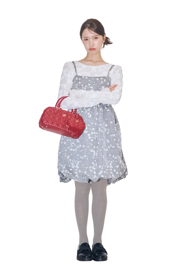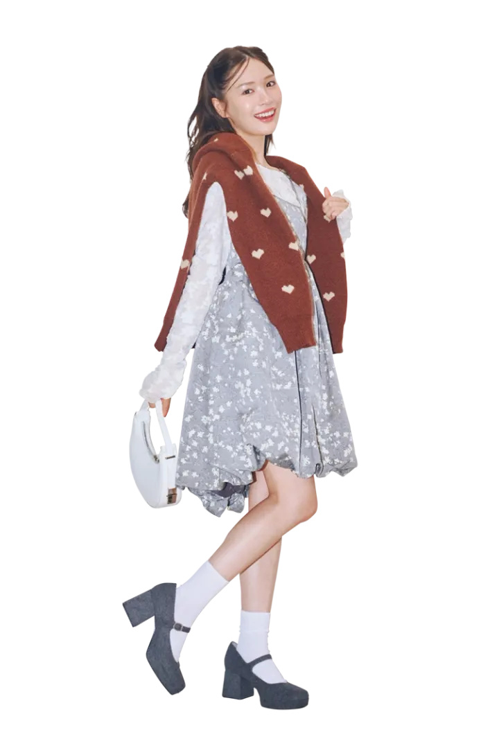 ボディスーツは着回し。花柄バルーンワンピース 22,000円/HONEY MI HONEY ハート柄ニット 7,590円/MORE self LOVE バッグ 3,280円/神戸レタス ソックス(3足セット)1,188円/チュチュアンナ パンプス 9,900円/チャールズ&キース(チャールズ&キース ジャパン)