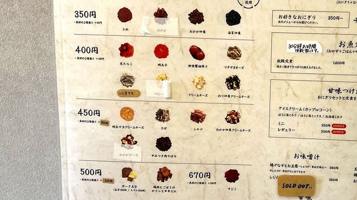 おにぎり(350円〜)の具材は、18種類!