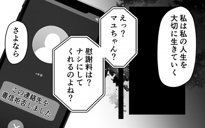 離婚を渋る夫は被害者だと言い出し、マユの母を責め、マユまで非難する。マユは夫の話に耳を貸さず、子どもと新たな生活を始めた。母からは「慰謝料をなしにして」と非常識な連絡が…。