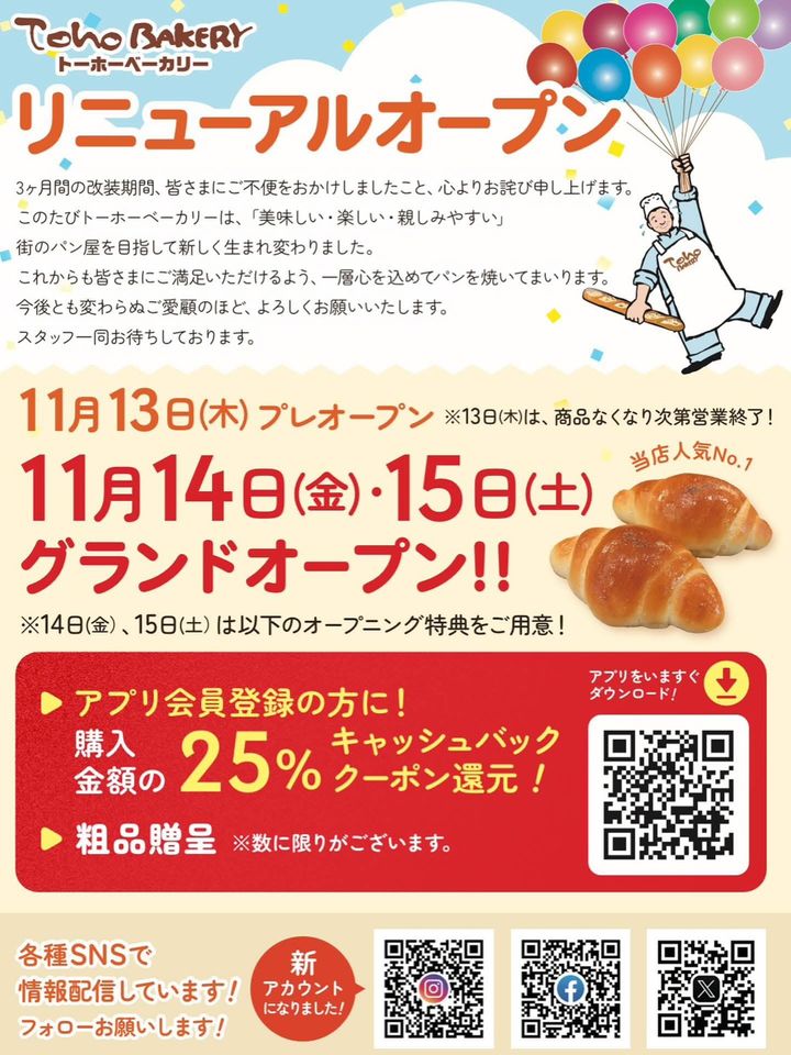 待ってました!みんな大好きトーホーベーカリー が、8月から約3か月間の改装を経て、ついに再開店します。プレオープンが11月13日(木)、グランドオープンは11月14日(金)・15日(土)です。