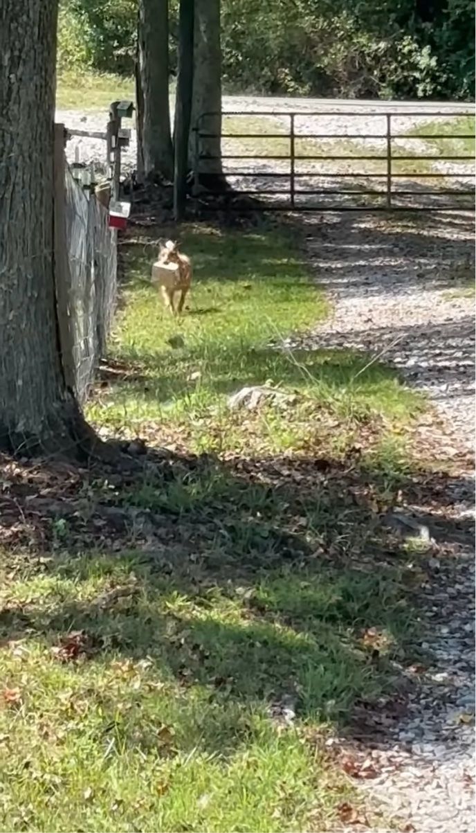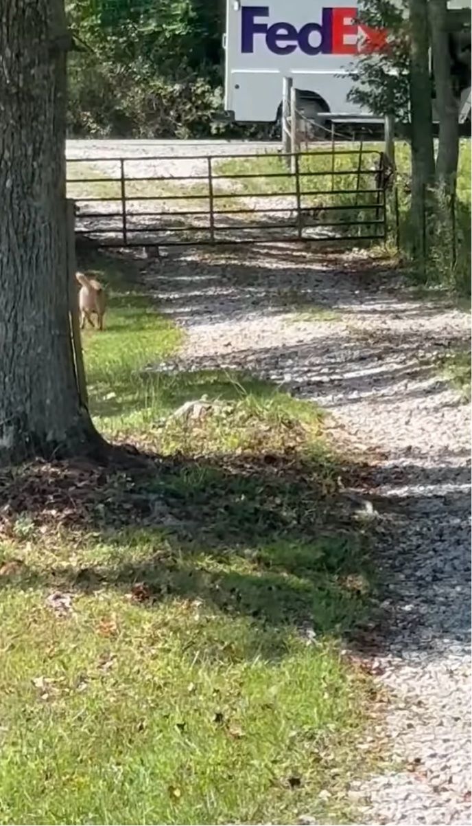門へとダッシュで駆け寄るこの子が、撮影者さんの愛犬『ハンク』。 その門の前を、宅配車が通り過ぎていきます。