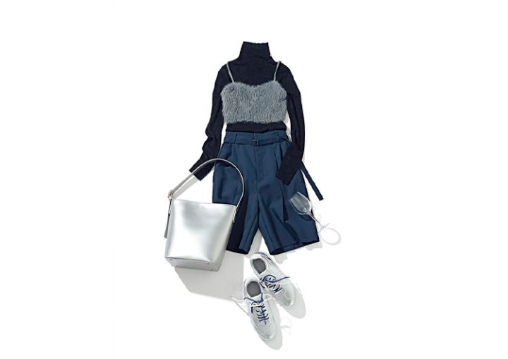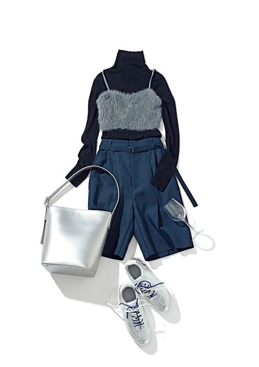ショートパンツ¥26,400/ドレスレイブ(ジオン商事) ビスチェ付きニットワンピース(ビスチェ)¥3,990、スニーカー¥2,990/ともにGU ラメ入りタートルニット¥8,990/PLST シルバーショルダーバッグ¥11,000/アルテミス by ダイアナ(アルテミス by ダイアナ アーバンドック ららぽーと豊洲店)