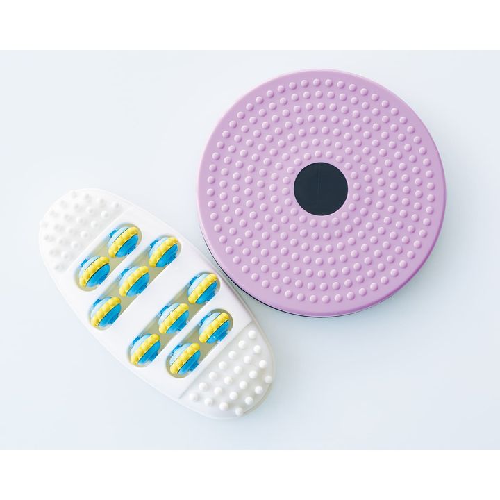 紫の円盤は腰かけて腰をツイスト。ドライヤーしながら使用。足ツボローラーで足裏を刺激することで巡りが良く。