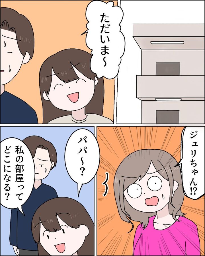 そして、夫とエリカさんのマンションに到着したジュリは、「ただいま」と声をかけると、「ジュリちゃん!?」とエリカさんがビックリ!「パパ~?私の部屋ってどこになる?」笑顔でたずねるジュリに、