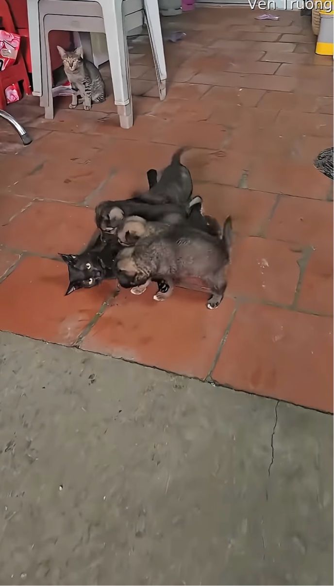 しかし、いかんせん多勢に無勢。 ひとりで4匹の子犬たちの相手をするのは無理と判断したのか、ネコはどこかへ行ってしまうのでした。
