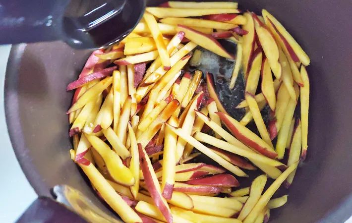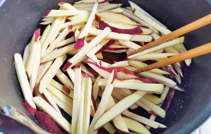 ボウルなどに水を張り、切ったサツマイモを入れてアク抜きをします。
