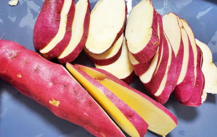 サツマイモは皮ごと使うのでよく洗います。斜め5mm幅にスライスしていきましょう。