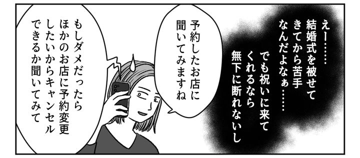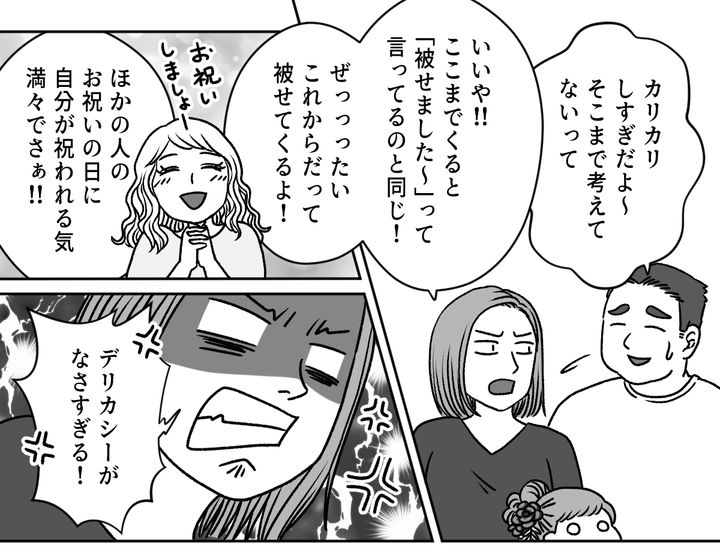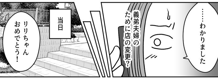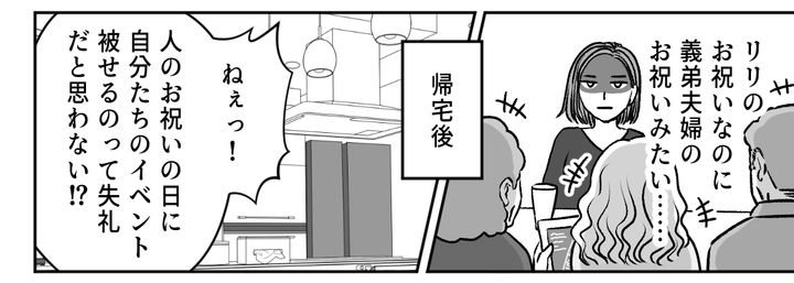 家に帰ってから、私は義弟夫婦への不満を旦那にぶつけます。誕生日には結婚式、そして今回の七五三では妊娠報告、どうしてリリのお祝いごとに被せてくるのでしょう。しかし旦那は、私が怒りすぎだと言うのです。私は今回の一件でいままで以上に、アンジュちゃんたちとはなるべく会わないようにしようと決めました。