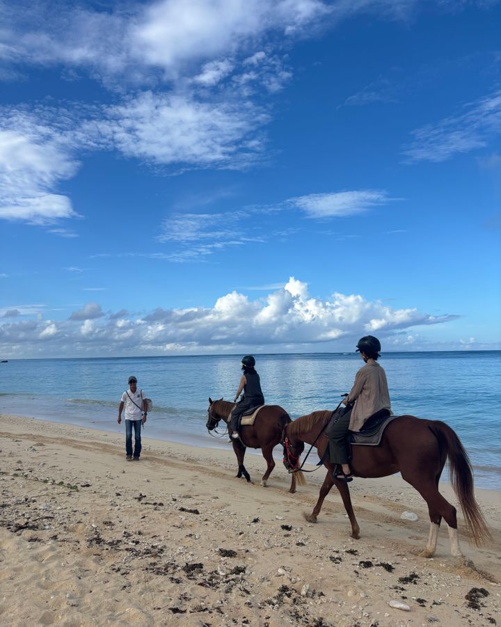 早朝はビーチで「朝凪よんなー乗馬」体験も。目の前に広がる海と白い砂浜を馬と一緒にゆったり歩く時間は、物語のワンシーンのよう。