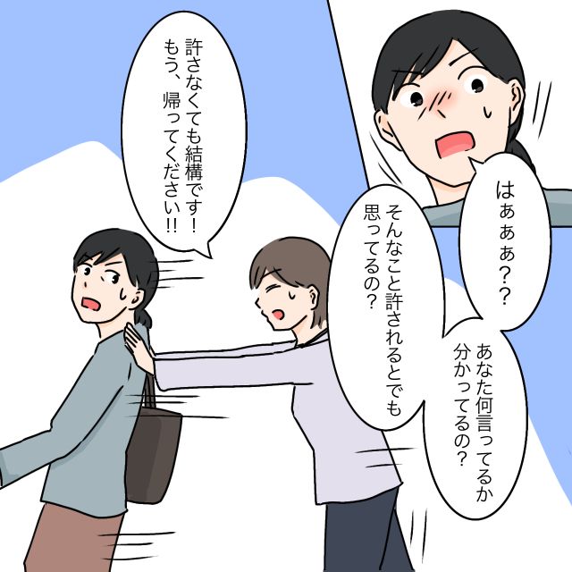 義母は私に言い返されると思っていなかったのか、少し動揺して「あなた何言ってるか分かってるの?そんなこと許されるとでも思ってるの?」と言いました。私は義母の背中をぐいぐいと押しながら「許さなくても結構です!もう帰ってください!」と言い、家から追い出しました。