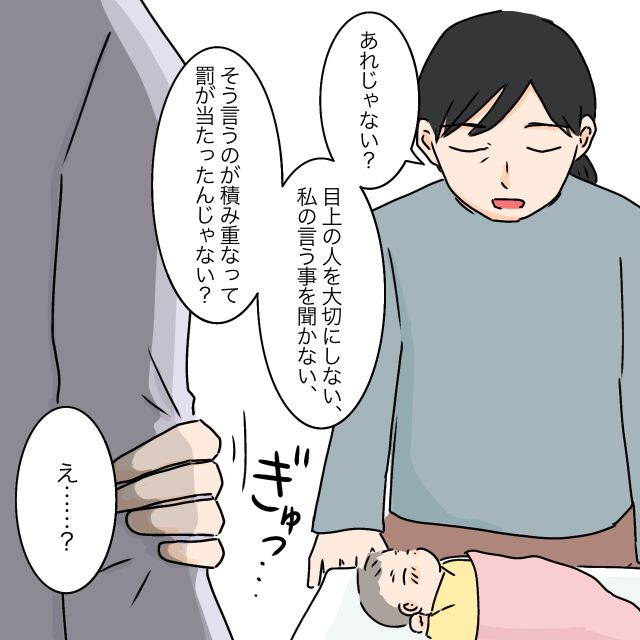 私が言い返さないのをいいことに、義母の嫌味はヒートアップ。「あれじゃない?目上の人を大切にしない、私の言う事を聞かない、そういうのが積み重なって罰が当たったんじゃない?」男の子を授からないのは私の日頃の行いが悪いせいだと言い始めました。