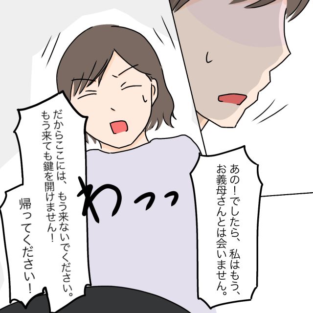 その時、私の中で何かが切れた音がしました。もうどうなってもいい・・・私は大きく息を吸い込み「でしたら私はもうお義母さんとは会いません!だからここにはもう来ないでください!来ても鍵は開けません!帰ってください!」今まで出したこともないような大きな声で、義母に言い放ちました。