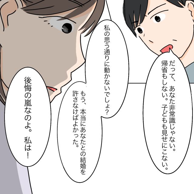 「だってあなた非常識じゃない!帰省もしない、子どもも見せに来ない、私の思う通りに動かないでしょ?」私への不満を次々と並べる義母。そして、私とユウタの結婚を心底後悔していると言いました。この人にとって、嫁は、子どもは何なんだろう。
