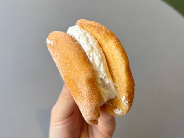 続いては、北海道産牛乳を使用したスフレサンド。手で持つと生地に吸い込まれそうになるくらい柔らかなスフレ生地に、ホイップクリームがたっぷり挟まれています。