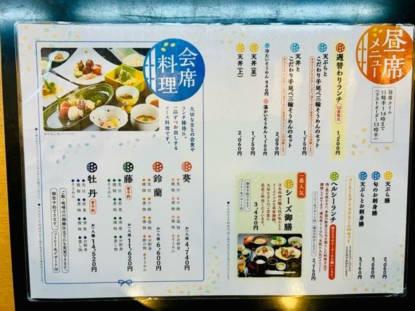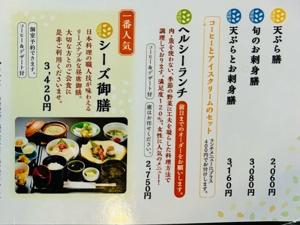 他にも、本格和食ランチが勢ぞろい。週替わりランチの1,200円~会席料理の14,520円まで幅広いラインナップです。 予約はヘルシーランチ以上のコースで、シーズ御膳以上のコースだと個室予約も可能です。今からの季節は忘年会や新年会の予約が多くなるとのこと、大いに納得です。