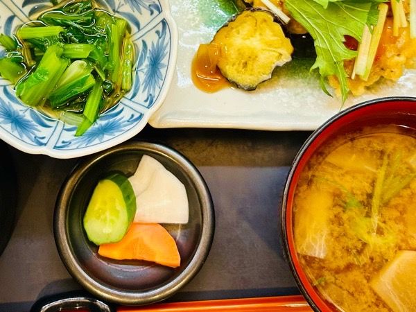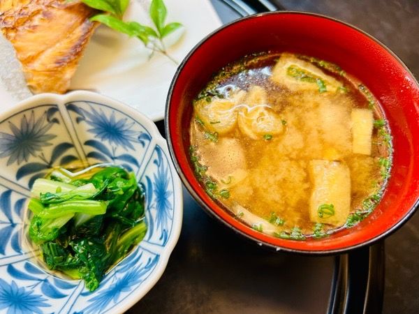 「青菜のお浸し」「大根と葱のお味噌汁」 家庭料理の定番とも言えるこちらのサイドメニューも、塩分に頼らない出汁の旨味や野菜の歯ごたえ、温度など、当たり前ですが全然違って本当に美味しい!