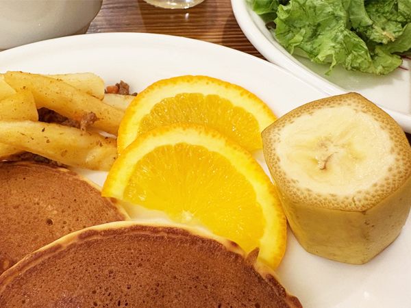 フルーツはオレンジとバナナ。パンケーキと一緒に食べれば、すっきりとした味わいが楽しめました。