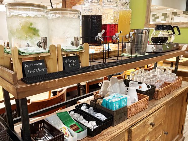 コーヒー、紅茶、オレンジジュース、デトックスウォーターなどドリンクも充実