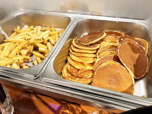 ドリンクバー、スープ、サラダ、フルーツ、パンケーキ、ポテトフライ、食パンとシンプルなラインアップですが、モーニングメニューとしてはちょうどいい品数。量が少なくなると、まめに補充してくれるのであわてずにピックアップすることができます。