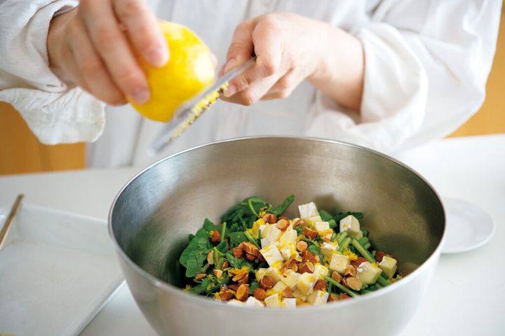 先生:切ったものをボウルに入れて、オリーブオイルをまわしかけ、米酢、粗塩をふります。柚子の皮を削って散らしたら完成です。さて、このまま「キノコとハーブのワイルドライス」を作っていきますよ。