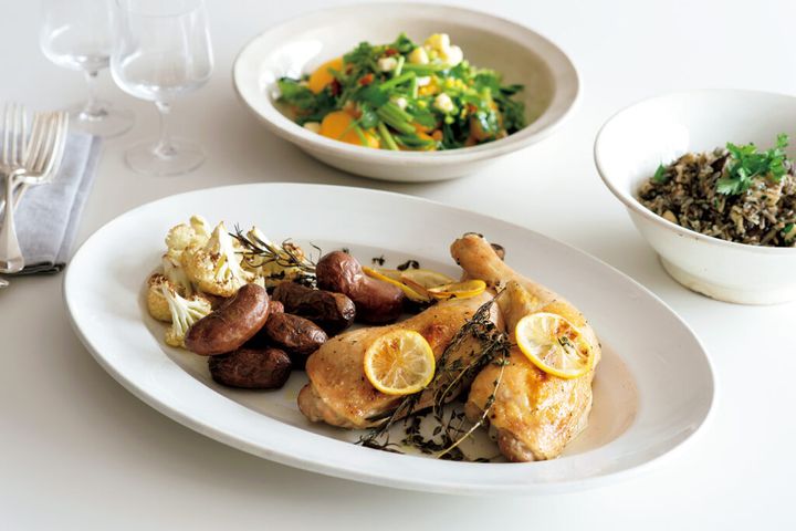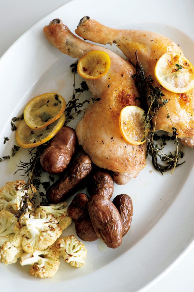 3.オーブンを200℃に温める。天板にオーブンシートを敷いてローズマリーとタイムを置き、レモンの輪切りをのせる。その上に骨付き鶏モモ肉を置き、オリーブオイル(小さじ1/2)を皮目に塗る。カリフラワーと小ジャガイモをまわりにのせてオリーブオイル(小さじ1)をふる。