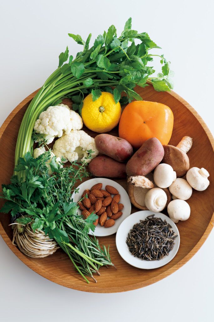 秋は食材の宝庫。キノコやイモ、柿も食べ頃。ナッツや穀物もおいしい季節です。