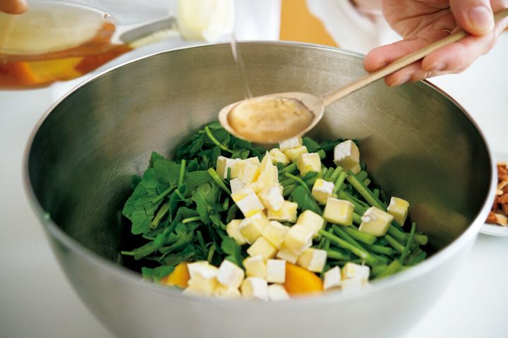 先生:そうそう。使い慣れれば何でもないの。オーブンで40分ほど焼くので、その間に「柿と芹のサラダ」を作りましょう。柿の皮をむいたら16等分に切ります。芹は3㎝長さに切りましょう。今日は柔らかい部分だけ使いたいので、根っこはお味噌汁の具などにしてね。さて、アーモンドはローストしてから粗めに刻み、チーズは1㎝角に切ります。チーズは、ほかの食材の邪魔をしない優しい味わいのものが合いますよ。今回はブリー・ド・モーという白カビのチーズを使いますが、カマンベールでもおいしくできます。