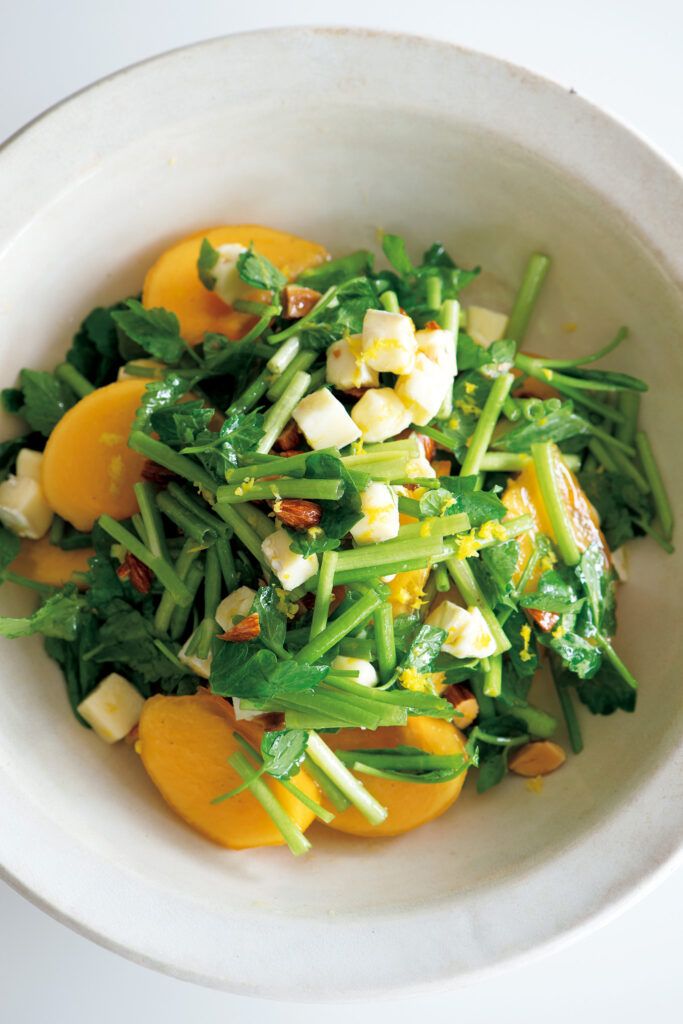 1.柿は皮をむき、16等分に切る。芹は3㎝長さに切る。ローストしたアーモンドは粗めに刻む。