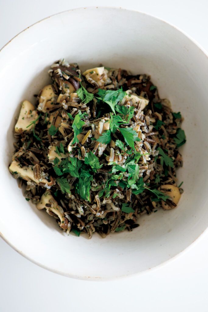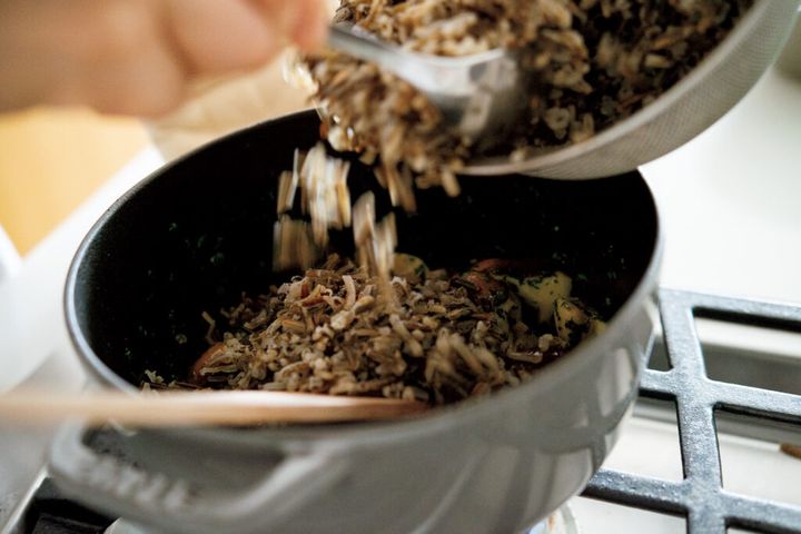 先生:ワイルドライスはざっと洗ってからお湯で20分茹でてザルにあげます。椎茸とマッシュルームは4等分に切り、ハーブは粗めに刻みましょう。鍋にオリーブオイルを熱したら、椎茸、マッシュルーム、ハーブの順に中火で炒めて、フタをして弱火で3分蒸し煮にします。ワイルドライスを加えてさらに炒め、粗塩、バターを加えたら出来上がりよ。