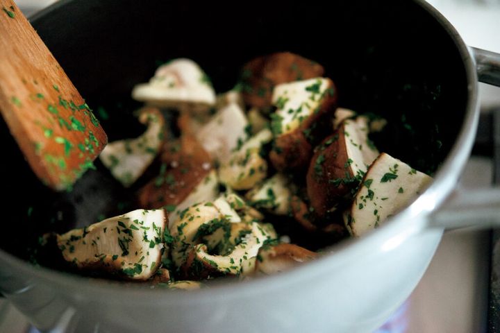 オリーブオイルで炒めたキノコとハーブを蒸して、旨味と香りを引き出す。