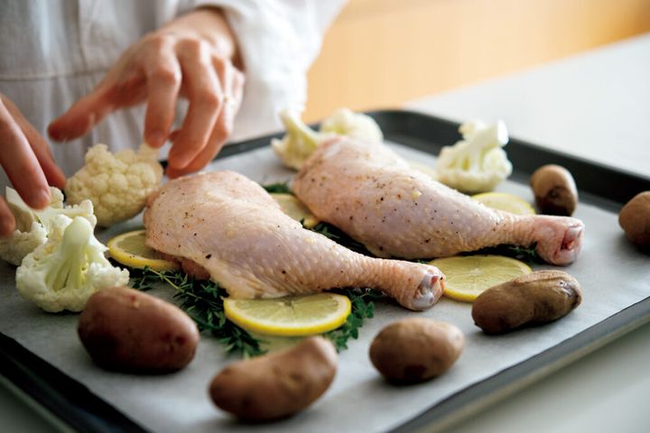 先生:オーブンを200℃に温めたら天板にオーブンシートを敷き、香り付け用のローズマリーとタイムを置いて、レモンの輪切りをのせましょう。その上に鶏モモ肉を置いて、皮目にオリーブオイルを塗ります。肉のまわりにカリフラワーと小ジャガイモをのせたら、オリーブオイルをふってください。