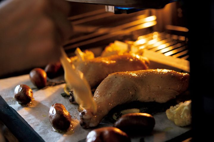 先生:はい。皮がおいしそうに焼けています。残りのオリーブオイルを鶏モモ肉の皮目に塗って、7〜8分焼いたら完成ですよ。