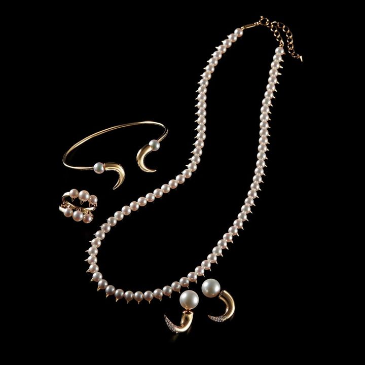 左から:〈デインジャー〉リング[K18YG×あこや真珠]¥471,900、〈デインジャー ホーン〉ブレスレット[K18YG×あこや真珠]¥638,000、〈デインジャー〉ネックレス[K18YG×あこや真珠]¥1,058,200、〈デインジャー ホーン〉イヤリング[K18YG×南洋真珠 白蝶×DIA]¥1,617,000(全てTASAKI)