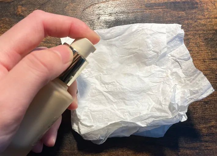 リキッドファンデーションのように液体のコスメの場合、中身をティッシュやキッチンペーパーに吸わせます。