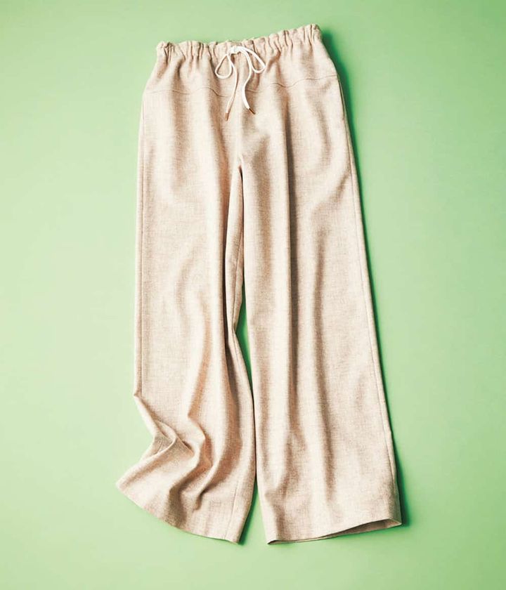 オートミールカラー、切り替え、素材など安っぽくなく、きちんと見えするリラックスパンツ。同素材のトップスとセットアップで着るのも素敵です。
