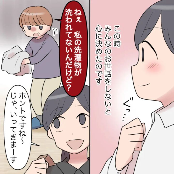 仕事が決まった私は、もうみんなの言いなりでお世話や雑用なんてしないと心に決めました。それからはいつものように義母に「私の洗濯物が洗われてないんだけど?」と私ができていないような言い方をされても「ホントですね~。じゃ、いってきまーす」と笑顔で仕事に出かけるようになりました。